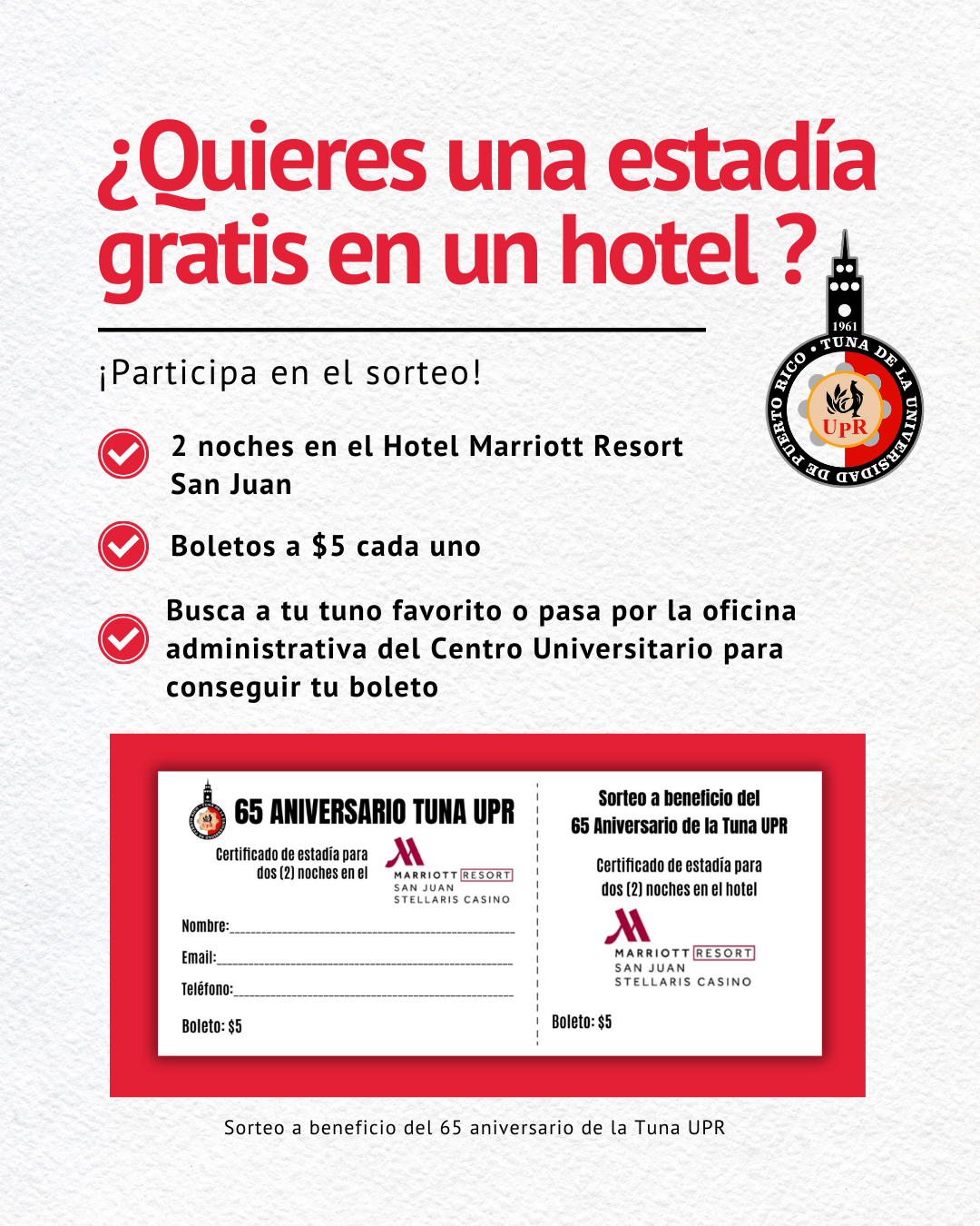 La Tuna de la Universidad de Puerto Rico llevará a cabo un sorteo a beneficio de su 65 aniversario. Con la compra de un boleto a $5.00, podrías ganar una estadía de 2 noches en el Hotel Marriott Resort en San Juan.