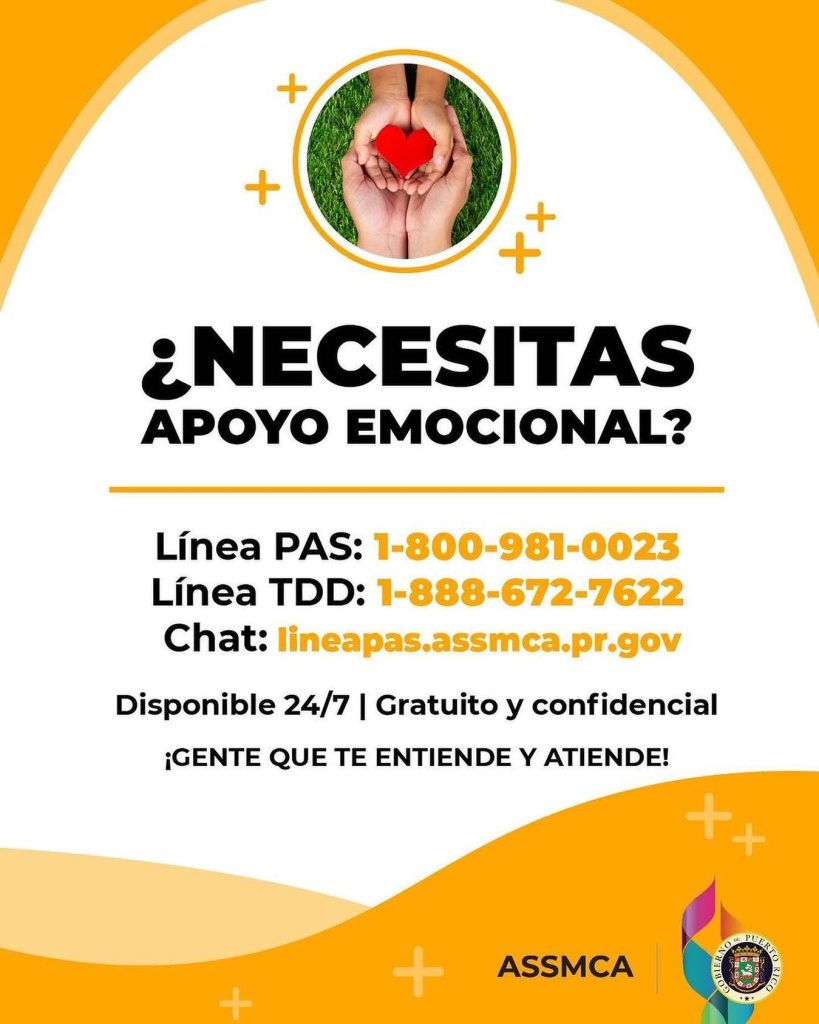 La Línea PAS es un servicio confidencial y gratuito disponible las 24 horas del día, los 7 días de la semana, brindado por la Administración de Servicios de Salud Mental y Contra la Adicción (ASSMCA) de Puerto Rico. Ofrece apoyo emocional, consejería en crisis y coordinación de servicios de salud mental.